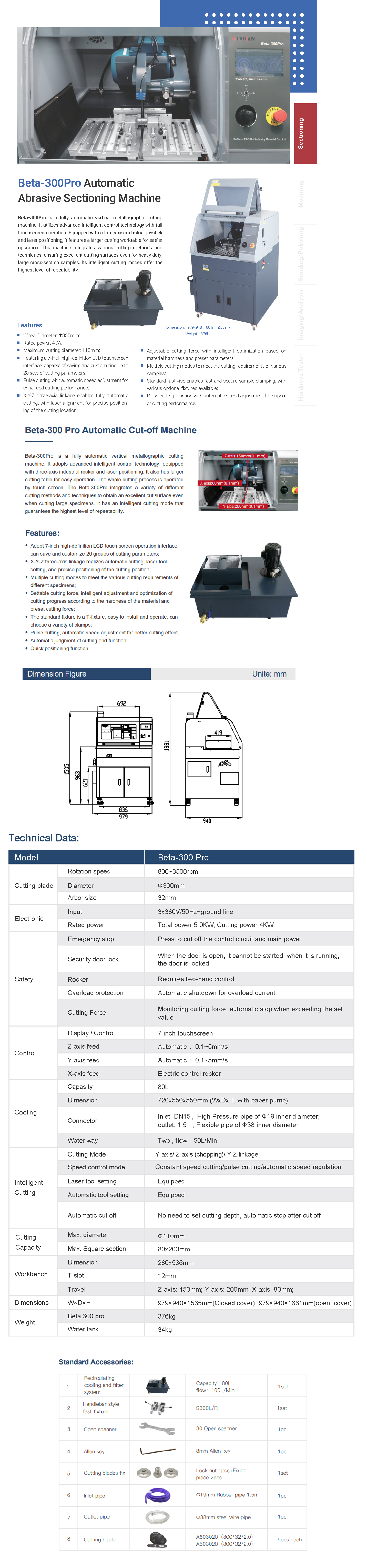 Beta-300Pro เป็นเครื่องตัดโลหะแนวตั้งอัตโนมัติเต็มรูปแบบ เครื่องนี้ใช้เทคโนโลยีควบคุมอัจฉริยะขั้นสูงพร้อมการทำงานแบบหน้าจอสัมผัสเต็มรูปแบบ ติดตั้งจอยสติ๊กอุตสาหกรรมสามแกน และตำแหน่งเลเซอร์ มีโต๊ะทำงานการตัดขนาดใหญ่ขึ้นเพื่อการใช้งานที่ง่ายขึ้น