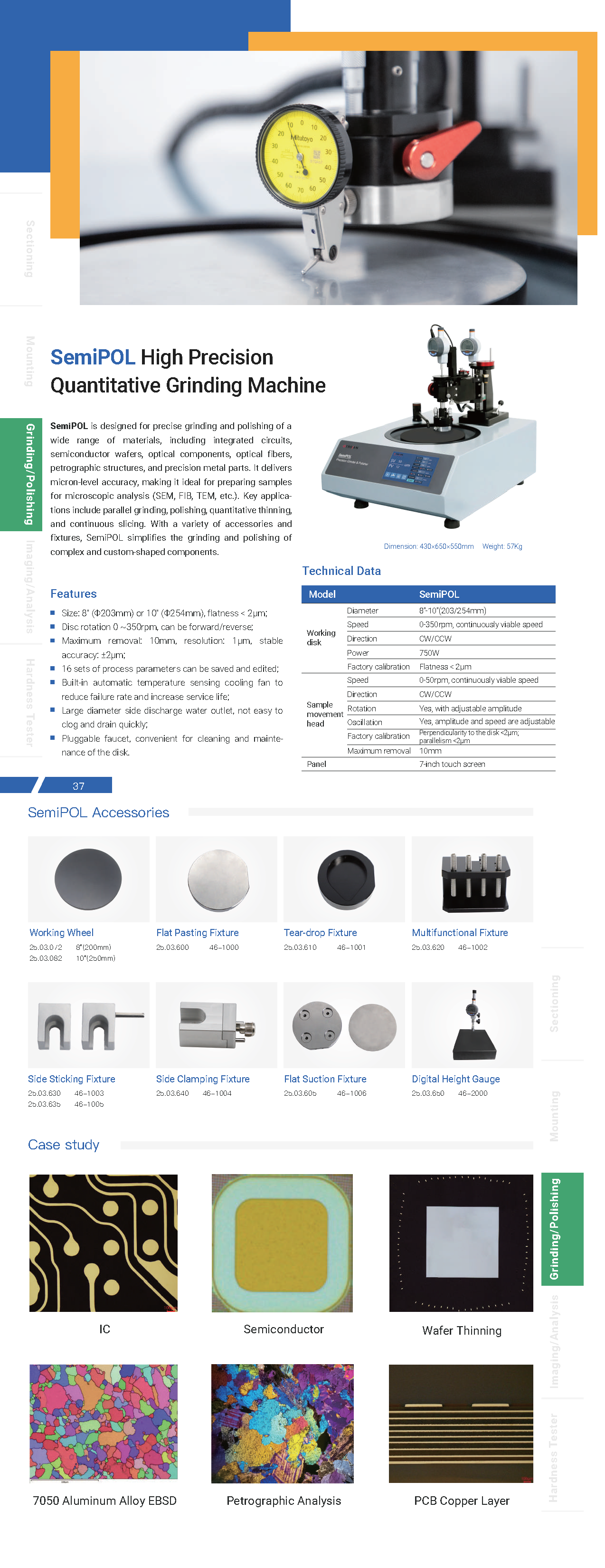SemiPOL สามารถบดและขัดวัสดุต่างๆ ได้อย่างแม่นยำ (เช่น วงจรรวม, เวเฟอร์เซมิคอนดักเตอร์, ส่วนประกอบออปติคัลและเส้นใยแก้วนำแสง, โครงสร้างหิน, ชิ้นส่วนโลหะที่มีความแม่นยำ ฯลฯ) สำหรับการวิเคราะห์ด้วยกล้องจุลทรรศน์ (SEM, FIB, TEM ฯลฯ) ความแม่นยำของเป้าหมายสามารถเข้าถึงระดับไมครอนได้ ส่วนใหญ่ใช้สำหรับการบดและขัดแบบขนาน, การกลึงบางเชิงปริมาณ, การหั่นต่อเนื่อง และการใช้งานที่ต้องการความแม่นยำอื่นๆ ด้วยอุปกรณ์เสริมและอุปกรณ์จับยึดที่มากขึ้น ทำให้การบดและขัดชิ้นส่วนที่มีรูปร่างซับซ้อนและพิเศษเป็นเรื่องง่ายและสะดวกยิ่งขึ้น