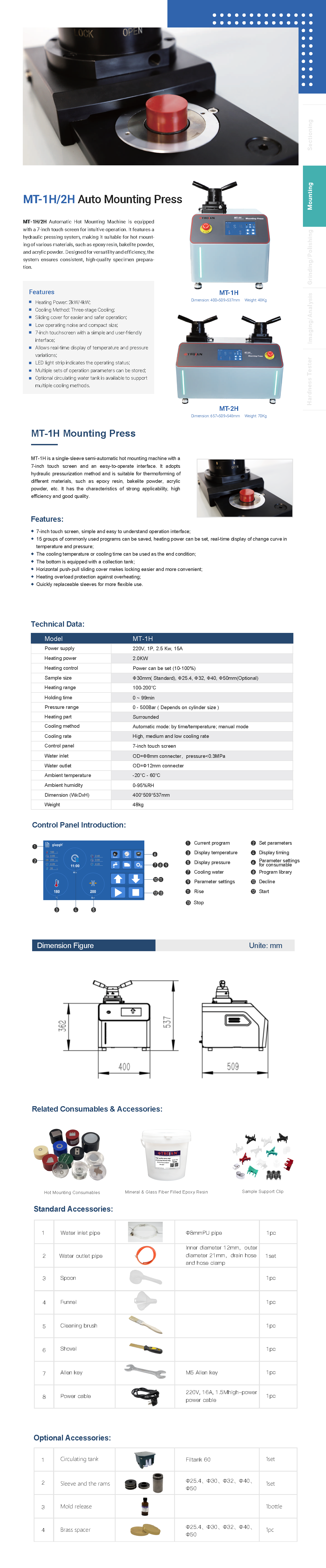 MT-1H เป็นเครื่อง Auto Mounting Press แบบกึ่งอัตโนมัติหลุม เดี่ยวพร้อมหน้าจอสัมผัสขนาด 7 นิ้วและอินเทอร์เฟซที่ใช้งานง่าย โดยใช้หลักการอัดแรงดันแบบไฮดรอลิก และเหมาะสำหรับการขึ้นรูปด้วยความร้อนของวัสดุต่างๆ เช่น เรซินอีพ็อกซี่ ผงเบกาไลต์ ผงอะคริลิก เป็นต้น เครื่องนี้มีคุณลักษณะเด่นคือ สามารถใช้งานได้อย่างมีประสิทธิภาพ ประสิทธิภาพสูง และคุณภาพดี